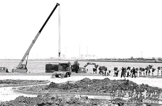 近日,赤坎军民路旁的滨湖公园一期工地,施工人员正在园区种植风景树(如图)。据了解,滨湖公园一期的建设面积为18.14公顷,预计本月底完成并对市民开放。滨湖公园主要由临湖游赏区、生态休闲区、飞鸟休栖区和生态培育区等几大景区组成,将成为我市最大的湖泊湿地生态公园。