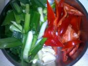<br/>蒜苗洗净切段 红椒切形 蒜瓣拍扁。</li><li>3