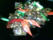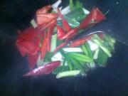 <br/>等蒜苗 红椒 炒软就倒入炸好的猪肉片。</li><li>9