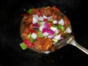 汤汁还未干时,加入青红椒、洋葱,炒匀,煮2分钟</li> </ul> <ul><li>10