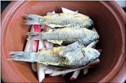 <br/>炒过的萝卜条一半放入砂锅中,上面放入三条煎过的小鲫鱼,然后再放入另一半萝卜条,再把令外的鲫鱼放在上面。</li><li>8