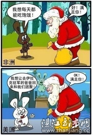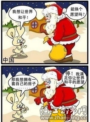 <em style="margin-top:0px;margin-right:0px;margin-bottom:0px;margin-left:0px;padding-top:0px;padding-right:0px;padding-bottom:0px;padding-left:0px;font-style:normal;"> 圣诞节</em>,3位小朋友许愿——非洲小朋友:我想吃蛋糕。圣诞老人:OK满足你。美国小朋友:我想让在伊拉克的爸爸回家。圣诞老人:OK满足你!中国小朋友:我想让世界和平!圣诞老人:换个愿望嘛!小朋友:那我想有自己的房子。圣诞老人:算了!那我还是让世界和平吧!