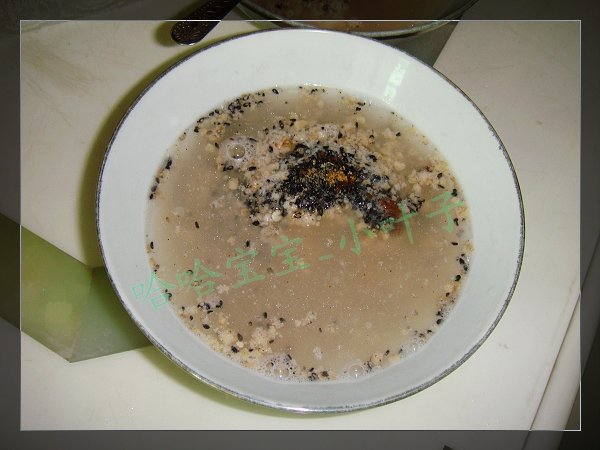 下面就是热气腾腾的粥了哦。 燕麦芝麻核桃粥 营养价值就不用说了,而且很方便哦,宝宝饿的时候随时都可以弄的。 先放即食的燕麦片,