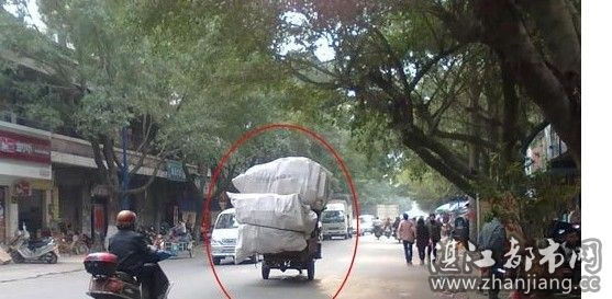车厢上面装着满满的一车货物。上面挨挨挤挤地绑着几大包东西,有些已经绑到车厢打开的后档板的上面,甚至有些更绑到了驾驶室的上面。该车摇摇晃晃地驶过,两边的行人纷纷瞪大眼睛向其行“注目礼”。