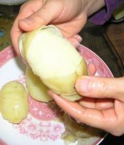 <br/>泡过凉水的土豆用两只手,按不同的方向转动一下,像我们平时打开瓶子盖一样。睢,整个的土豆皮就去掉了!</li><li>5