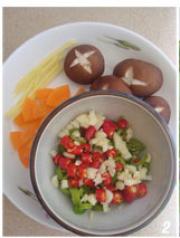 胡萝卜、香菇切花,姜切丝,沾料:姜、蒜、葱、青红椒切碎粒待用。</li> <li>3
