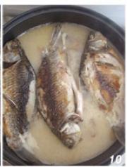 鲫鱼控干水分,锅下油,慢火把鲫鱼煎至微黄。</li> </ul> <ul><li>10