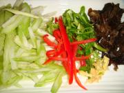 锅里少许油倒入芹菜丝 黑木耳翻炒</li> <li>6