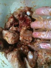 <br/>将蒜梨泥及辣椒粉放入排骨中用手搅拌,使之入味。腌制大概20分钟。</li><li>6