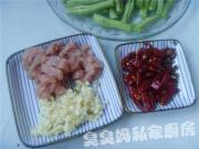 <br/>将豆角去筋洗净,滤干水分掐段;蒜切成末;肉切小丁备用。</li><li>3