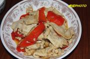 <br/>全部鸡片滑油成熟后,另起油锅,葱姜爆香,将提前制备好的红柿子椒片下锅炒,下入全部鸡片调味,勾少许芡汁就可以起锅了。</li></ul>