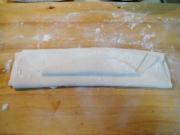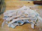 6、如把面片儿擀得薄些,然后切条儿不抻下锅煮也可以,根据大家的喜好切条儿、切棍儿、揪片儿都可以,这不属于什么高科技范畴,朋友们就尽情的发挥吧!