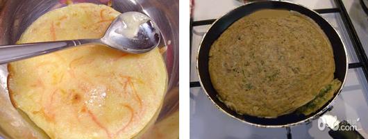 步骤3:平锅放油,将面糊倒入,小火慢煎,两面翻烙,直到面饼呈金黄色至熟,关火。