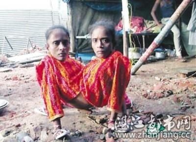 印度孟加拉邦巴斯尔哈特市现年40岁的甘加·蒙达尔和贾姆娜·蒙达尔姐妹是一对连体双胞胎,她们从腰部相连,拥有两颗心脏、两只肾脏、4条胳膊、3条腿、一只肝脏和一副生殖器官,姐妹俩必须手脚并用才能在地上爬行,所以她们也获得了一个“蜘蛛女”的绰号。这对连体姐妹靠在印度乡村集市上展览自己谋生养家,由于担心接受分体手术后将失去“谋生资本”,所以她们从来都拒绝接受任何分体手术。令人惊讶万分的是,这对连体姐妹在22岁时还一起嫁给了同一个丈夫——现年45岁的狂欢节工作人员盖达德哈尔,这名娶了连体姐妹的丈夫接受记者采访时还称,他“平等地爱着她们两个”!腹部长出手腿 全球最恐怖变异人大盘点