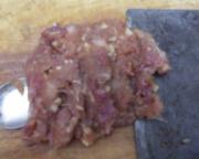 <br/>鸡脯肉加姜剁成肉馅。 加入生抽,盐姜,盐继续剁一会,馅少,就不必沾碗直接放菜板调馅。</li></ul><ul><li>4