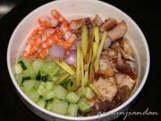 <br/>将虾去皮切段,鱼拆肉,鱿鱼切小块,黄瓜切粒,姜、葱头准备好。</li><li>3