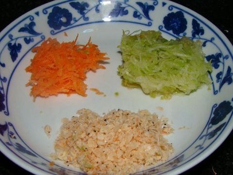 材料:胡萝卜丝,西葫芦丝,还有虾皮,(虾皮要先用热水泡一下,一是为是降低盐份,二是去沙等杂质),然后将这个材料切碎备用。