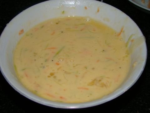 把刚刚准备好的蔬菜丁和虾米丁放在面糊里搅拌均匀