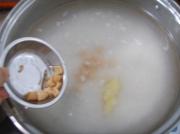 <br/>干贝连水和米一同放锅里,加进两片姜和清水,大火烧开后转中火煮至米开花。</li><li>5