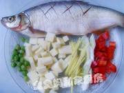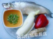 <br/>材料:鳜鱼、茭白、红彩椒、豌豆、姜丝、葱丝