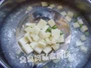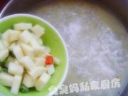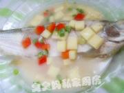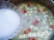<br/>将鱼汤入葱姜丝捞出,下茭白丁、豌豆、红彩椒煮2-3分钟。</li><li>8
