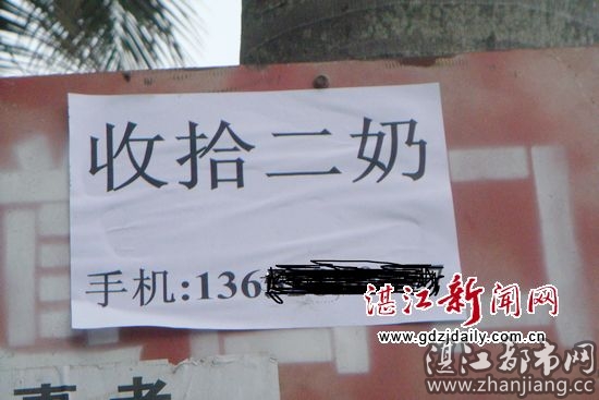 近日,记者看见廉江大道西街口附近一交通慢行指示牌上贴满了广告,其中一张16开左右,白纸黑字的广告,内容是:“收拾二奶”,十分雷人。(如图,号码已作遮盖处理)