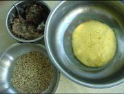 <br/>南瓜泥加糯米粉和成面团醒20分钟,准备好豆沙,芝麻。</li><li>2