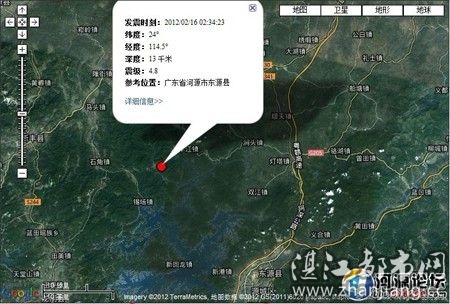 国家地震台网测定,北京时间2012年02月16日02时34分,在广东省河源市东源县(北纬24.0度,东经114.5度)发生4.8级地震,震源深度约13公里。