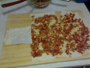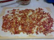 <br/>静止好的面团擀成博饼后把肉馅均匀的涂抹在面饼上。</li><li>6