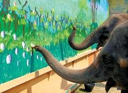 <br> 在泰国清迈府的一个大象园,几只大象在自己创作的画旁边合影。由8只大象在2.4米高,6米长的帆布上创作的这幅丙烯画最后以约3.95万美元的价格售出,成功打破了最高售价的大象绘画的吉尼斯世界纪录。 <br> <br> <br>