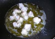 <br/>腌好的肉占裹一层淀粉和面粉(比例是1:2)的混合糊后,放入热油中炸黄捞出,炸油倒开,留一匙油炸香蒜末和青椒、红椒,再加入调好的汁。</li><li>8