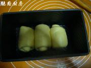 <br/>按片排气分割三等分醒发15分钟后,取一份按扁,两边折叠。</li><li>9