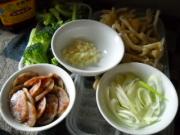 <br/>姬菇掰开,西兰花掰成小朵,洗净,入开水焯熟;腊肠切片蒸熟;大葱斜切片,蒜切粒</li><li>2