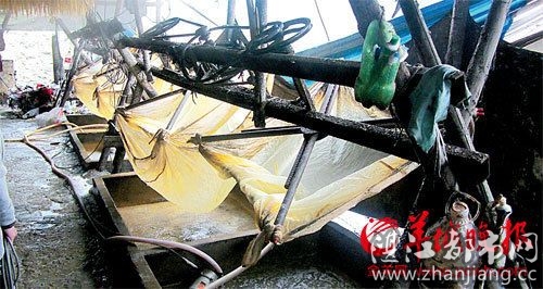 走进窝点, 即使小心地弯腰低头,记者和执法人员的头发依然会碰到挂着的腐竹。记者看到,窝点内部十分简陋肮脏,到处弥漫着豆制品、馊豆渣和燃烧废气的混合味道。一排用红砖和木头搭建的简陋沟槽上方, 挂着刚刚被捞起的热腐竹,整个操作台污渍斑斑。在沟槽旁边,还有一些白色粉末状添加剂,这些添加剂受潮后已变成凝固猪油状。窝点中间摆放的抽浆机和磨汁机锈迹斑斑,过滤布网也已经发黄,木架上结满蜘蛛网。