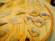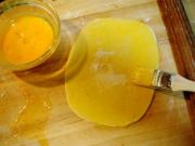 1、用高筋粉制作最好,饺子粉也能凑合,呵呵!到我这儿就要求不严了哈!合的面团儿要硬些,擀出的面皮才即滑爽又薄而筋道。宽条意面也可使用此面团儿,切成薄宽条就可以。合面时还可用菠菜汁或墨鱼汁,便是著名的意式黑、绿两款面条,即菠菜面和墨鱼面。馄饨也可做带色的,会更漂亮。