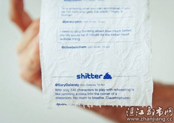 平常的话,比较忙没有时间看微博,Shitter 就开创了这个服务,将关注的微博信息印制到厕纸上,可以在如厕时无聊的时间,观看微博的更新。