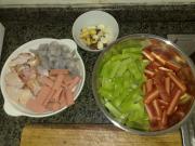 <br/>鸡翅切块、火腿肠切片(刚忘了…),莴笋、红萝卜切成长短相同的条状。</li><li>3