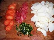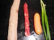 <br/>食材洗净,山药刨皮切片,香肠撕去外衣切片、胡萝卜也切片,葱切末。</li><li>3
