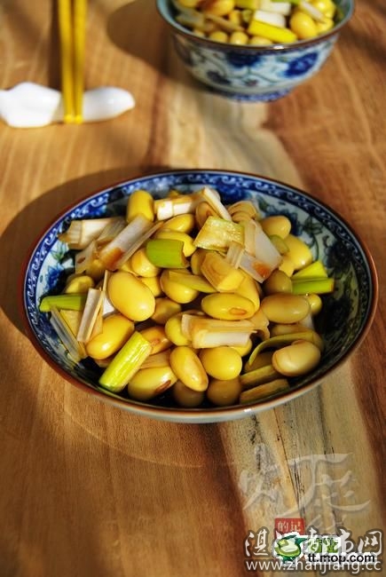 4、葱白随意切小块,和晾凉的黄豆混合;