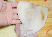 <br/>将鱿鱼拔去头部(带出内脏),并用剪刀剪开筒部,去骨后清洗干净。将鱿鱼须切段,在鱿鱼的背面(即有骨的一面)斜刀界麦穗花,之后切块。</li><li>3