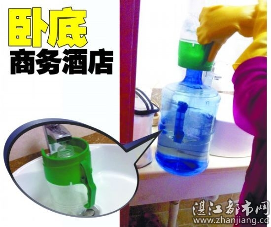 服务员“老师”的操作很熟练,可接下来她的动作却让记者看傻了--她把专用的抹布放在桶里涮了涮后就挂在了门上,转 身拿起客人用过的面巾擦拭起刚喷洒过清洁剂的面盆。“顺便抹一下这个就可以了,这样就干净了,就用这块浴巾。” 用面巾擦完面盆后,只见服务员又拿起了一块顾客用过的浴巾擦起了卫生间的墙壁。