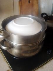 <br/>蒸锅,水开后,碗上面扣个盘子,中大火先整40分钟;然后, 掀开盘子,在碗中稍微抖上一些水。再扣上,再蒸40分钟。</li><li>11