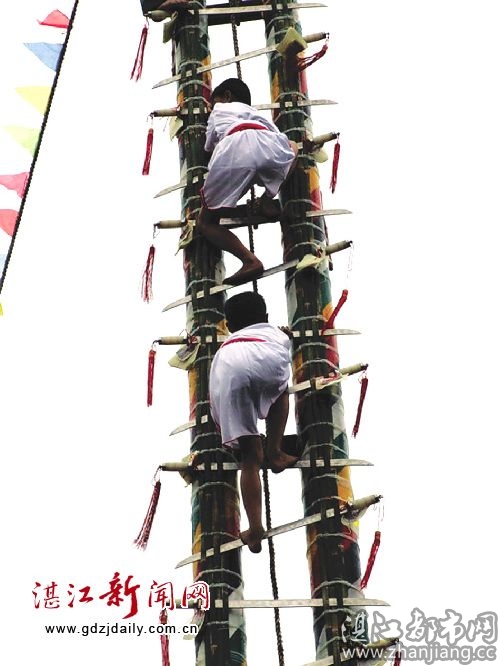 麻章太平镇麒麟村爬刀梯源于400年前先人除暴安良的传说。村里每年的年例都举行爬刀梯庆祝活动,每次慕名而来观看的人数超过万计,爬刀梯也成了麒麟村响亮的品牌,2007年被列为省非物质文化遗产。随着时代的进步和发展,“爬刀梯”成为一项扣人心弦、引人入胜的观赏性艺术,当地民众每年都把这项活动搞得热烈、隆重、精彩,远近闻名,备受当地人民喜爱。