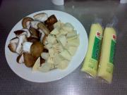 <br/>香菇和笋改刀备用,切块切片均可。日本豆腐先从中间切一刀,把其慢慢取出后切成棋子状。另切些葱姜备用。</li><li>2