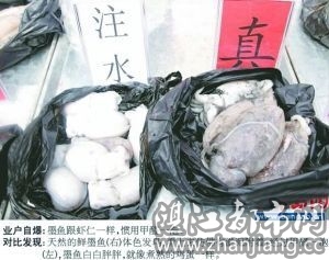 对比发现:天然鲜墨鱼(右)发乌;经甲醛一泡(左),墨鱼白白胖胖,就像煮熟的鸡蛋一样。