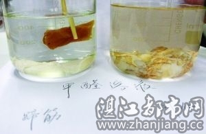 如果浸泡的水溶液中含有甲醛含量过高,那么泡出的虾仁和蹄筋就会带有强烈刺激气味,再好看的卖相,消费者也会自然而然敬而远之。记者用于实验的甲醛溶液经过了充分的稀释,将5毫升含量为37%到40%的甲醛溶液,加入到装有600毫升水的烧杯中,然后进行搅拌。