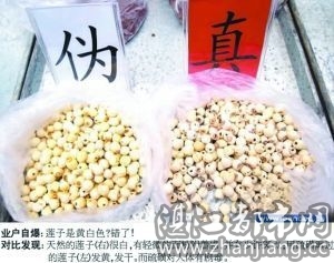 对比发现:天然莲子(右)很白,有轻微的面粉附着感,并有少许斑点;硫磺熏过的莲子(左)发黄、发干。