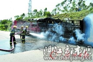 昨日14时许,湛江遂溪县公安消防大队接到110报警中心称:沈海线茂湛高速3457公里处(遂溪源水路段,湛江往遂溪方向,离官渡出口约7公里处),有一辆大货车行驶中突然着火,急需救援。接警后,遂溪大队迅速出动一辆水罐消防车、5名指战员赶赴现场实施救援(见上图)。