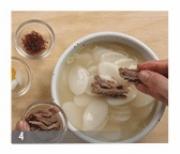 锅里倒入肉汤, 大火煮5分钟左右,直至沸腾,放入白米糕, 续煮3分钟左右, 米糕熟了浮上来时,用清酱与盐调味,加入葱再煮一会儿。</li></ul><ul><li>4