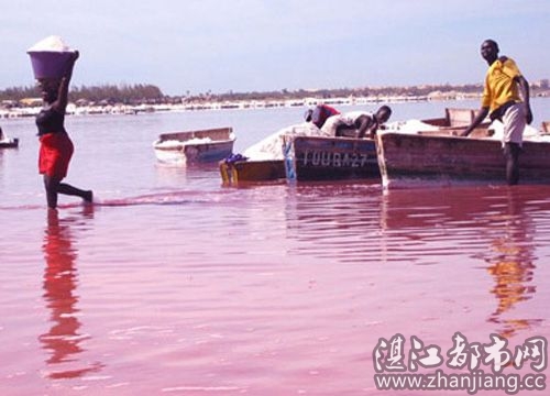 玫瑰湖是一个面积只有3平方公里的盐湖,它位于非洲大陆的最西端—塞内加尔的佛得角,距这个国家的首都达喀尔35公里。佛得角像一弯尖钩从非洲大陆伸向浩瀚的大西洋,玫瑰湖就安卧在与大洋一线之隔的地方。从空中俯瞰,一道细细的金色沙滩将碧蓝色的海水与粉红色的湖水分隔开来。海与湖都镶嵌着银白色的花边─海是浪花,湖是盐晶,色彩完美配搭,大自然不愧是丹青高手。当地居民在玫瑰湖里采盐,这里没有机械化的采盐工具,男人负责到湖里采盐,女人负责收集男人采上来的盐,辛勤劳作的场景为迷人的玫瑰湖增添了一道动人的风俗画卷。